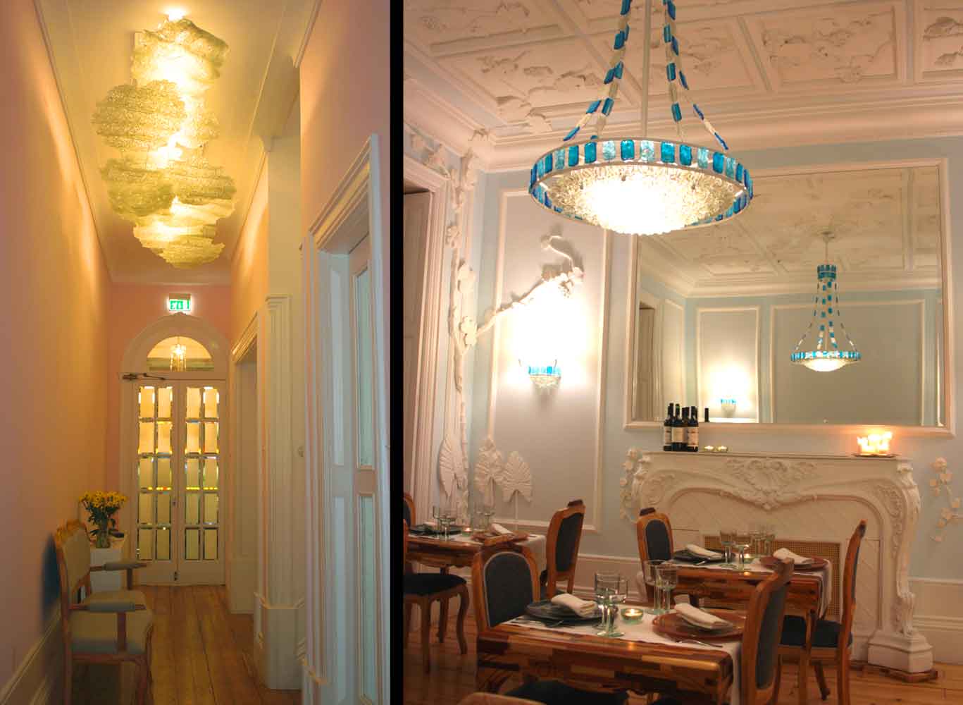 "EmCarneViva" Restaurant, Porto Portugal, fused recycled bottle glass panels, lamps and components.