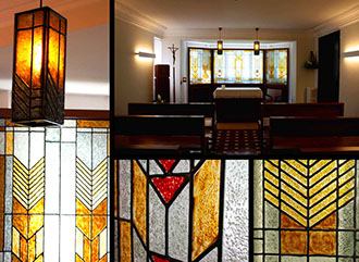 Private Chapel, Lisbon, Portugal, fused stained glass panel and lamps,(FLW revisited).
